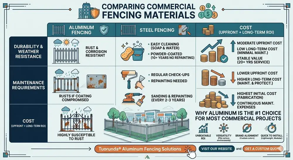 For most modern commercial projects, aluminum fencing remains the more practical option. It provides strong durability, low maintenance, flexible design, and stable long-term value for many types of commercial properties.
